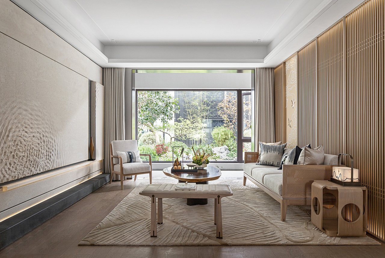 禅意包含的极简而雅致,闲暇时光中对自然的追求,大量的木质背景及家具,给予客厅最自然的状态,营造出世外桃源般的意境。朴素且清新,乃修身养性之地。