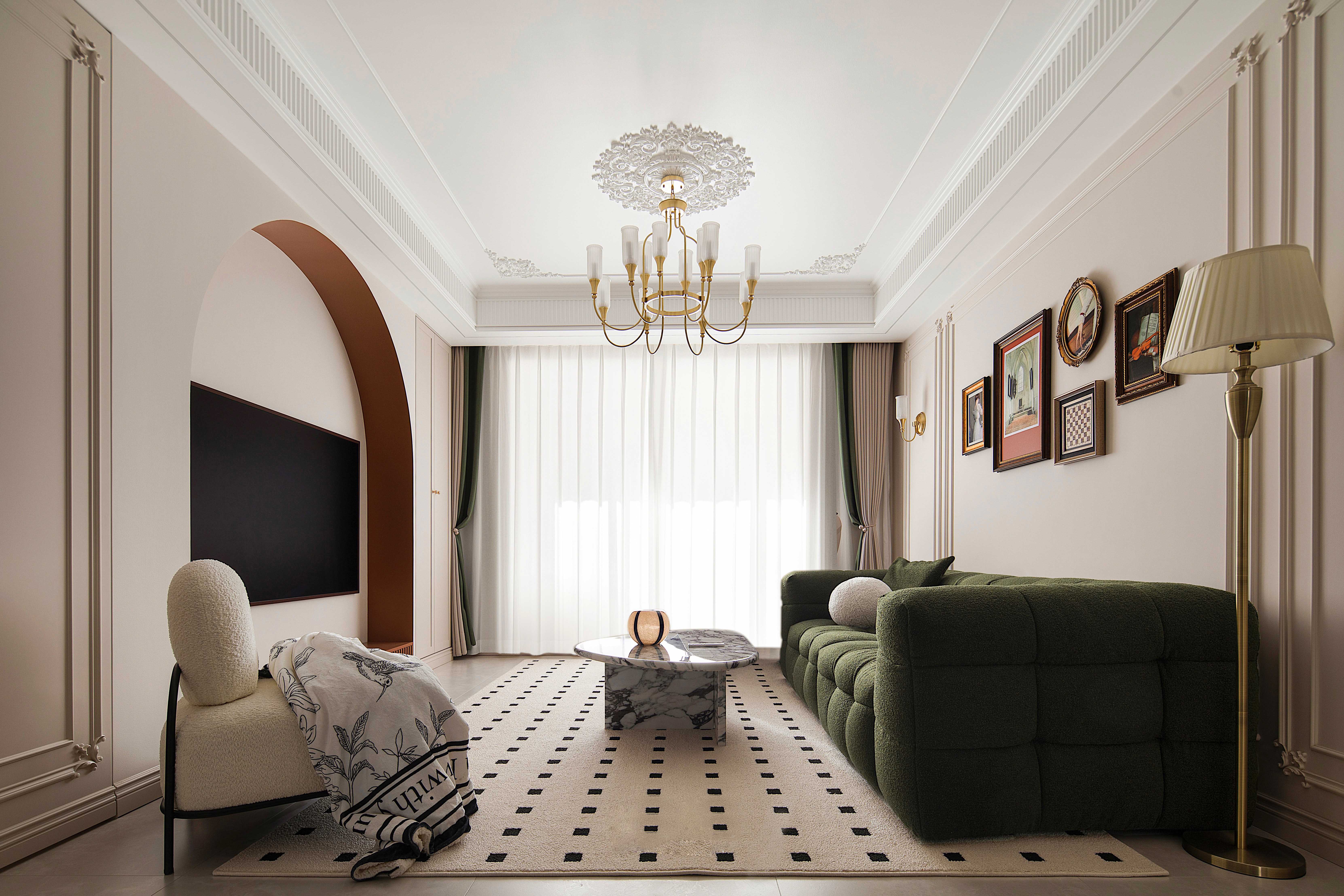 复古绿棉花糖沙发落下客厅重心,选用复古装饰画点缀,是自然静谧的呈现。法式地毯、云纹石材茶几、羊羔毛单椅,以软装塑造干净温馨的家居氛围。