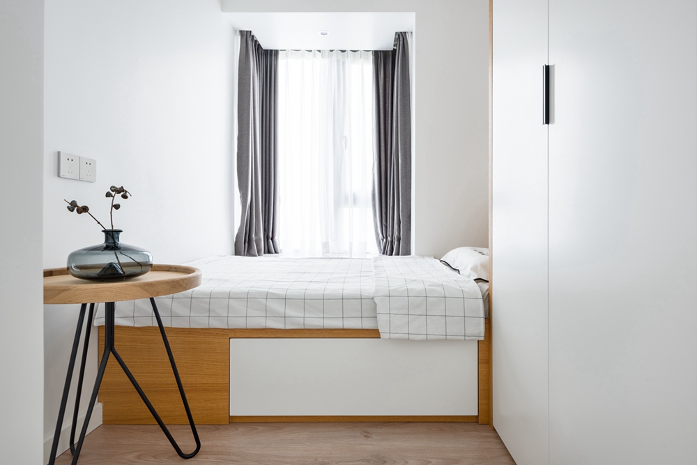 本案以建筑手法构建室内空间,以灰白为基调,大面积留白,黑色以线条形式出现,勾勒空间轮廓,再以木质提升空间的层次布局,用简练的设计语言,精简的软装搭配来赋予空间灵魂。
