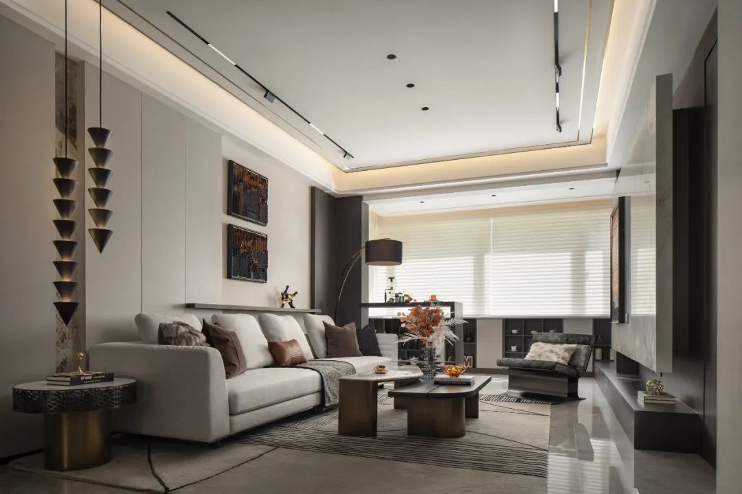 简洁的浅色沙发配以沉稳古韵的深色茶几及饰物...现代轻奢的整体脉络中西安的历史痕迹亦被穿插其中。金色、金属材质作为点睛贯穿空间,演绎优雅华丽的流金氛围。电视背景墙上采用立体构成手法的金属装饰挂画将斑驳的历史气韵层层晕染开来,角几的漏空造型从传统的窗花图案中提炼得来,让居者在低调奢华的居住体验中感受古都的文化之韵。
