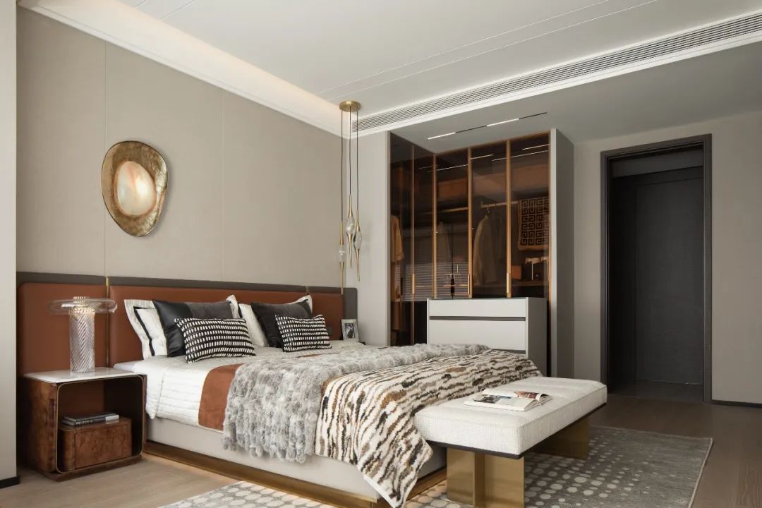 木质、金属、皮料的组合使用将居室的奢华气场与文雅风度调和得刚刚好,静谧的灰色系配以柔软的毛绒床品,松弛感渗透感官。复古的椭圆形金属壁挂,像浪潮下刚刚开蚌的珍珠,与金色的衣柜协调对话,带来华丽丽的视觉冲击。