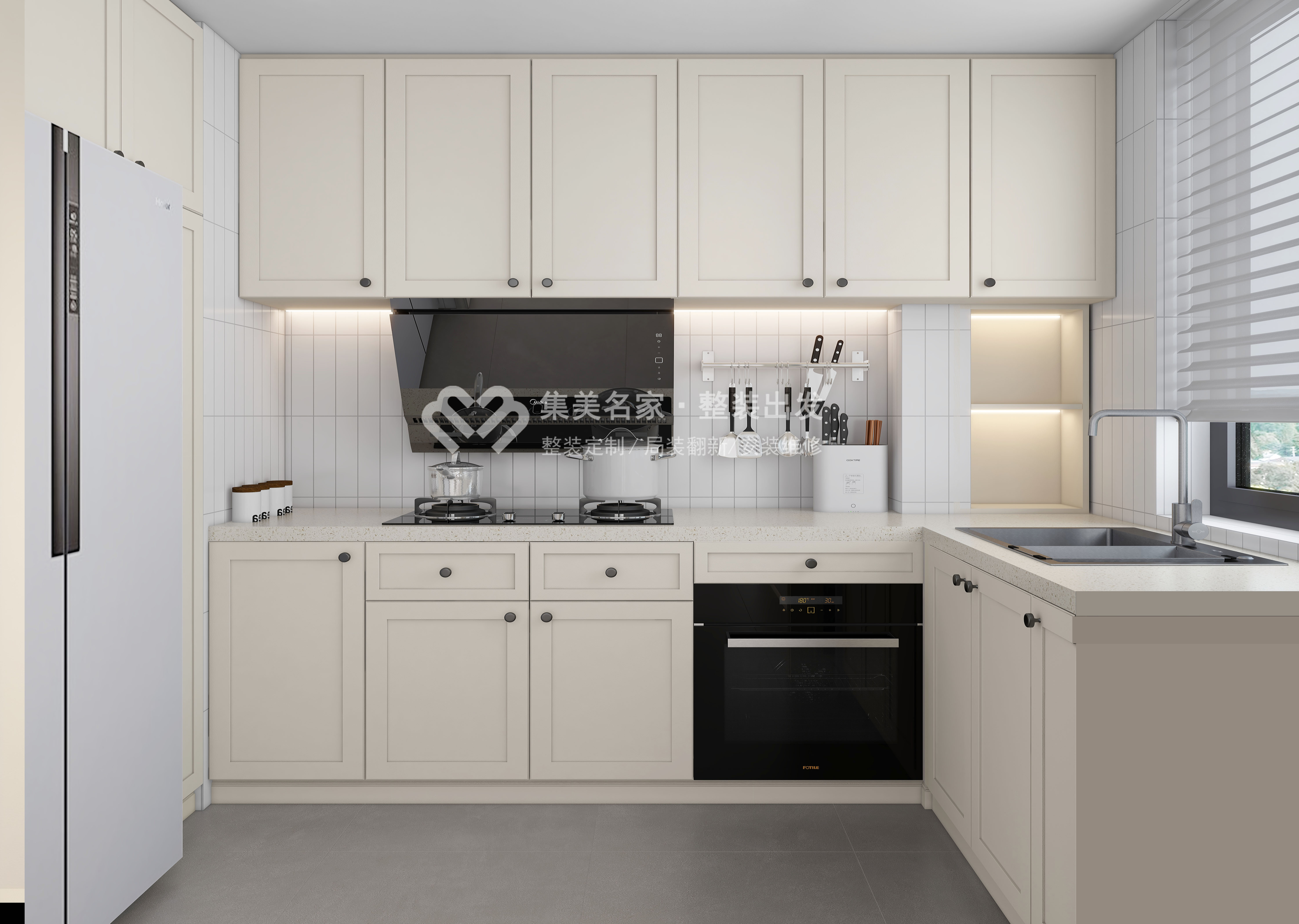 嵌入式冰箱的设计,让空间布局更显一体化。柜门板的设计灵感来源于经典的轻法式线条,优雅而精致。搭配暖色系灯带,营造出温馨舒适的氛围,同时黄铜拉手的质感更是提升了空间的品质感。