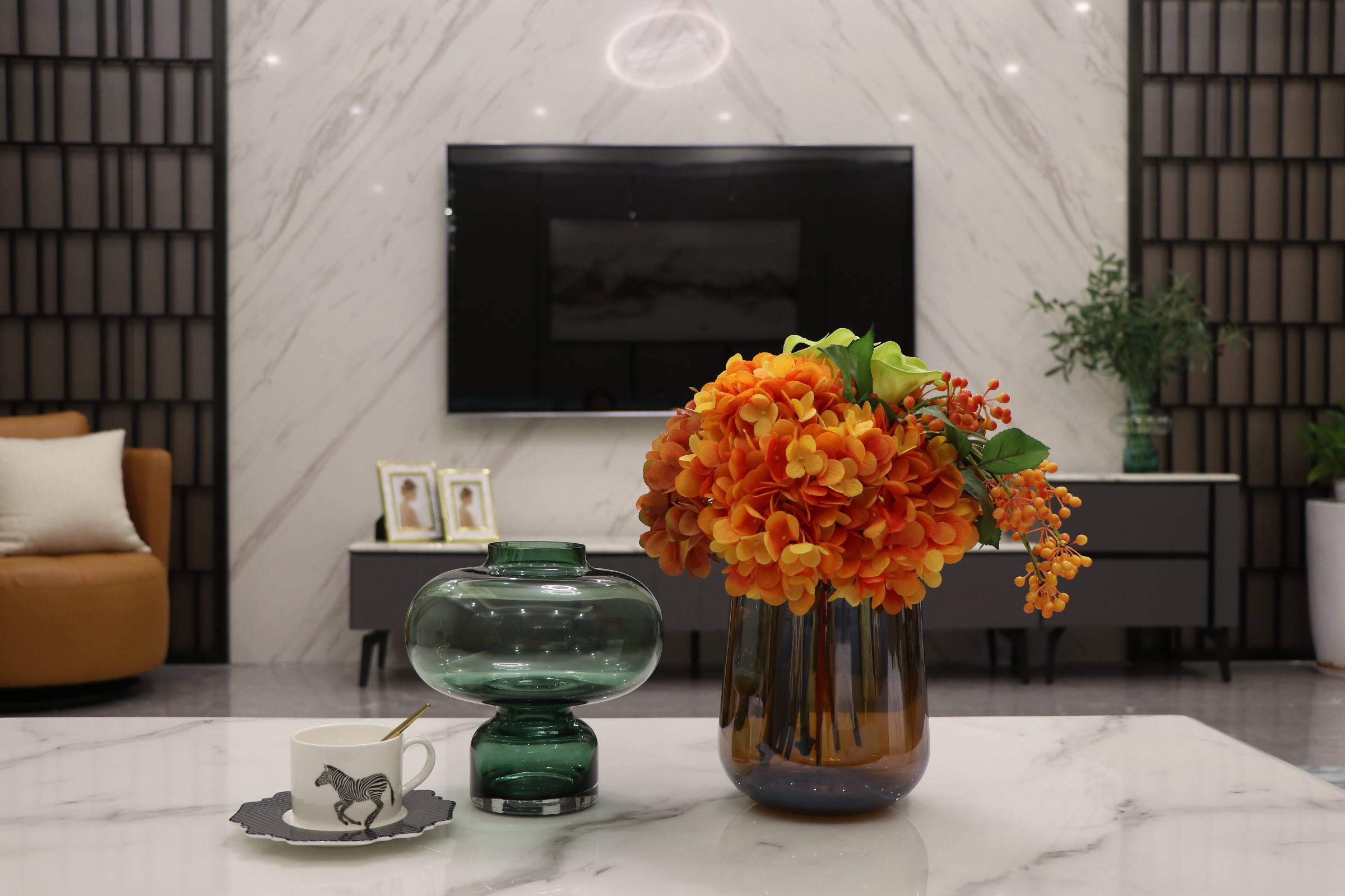 客厅在空间足够的设计手法下,灰蓝色的真皮沙发沙发搭配鱼肚白的大理石茶几,品质感与实用性兼具。爱马仕橙的呼应式搭配手法无疑让这个空间现代且时尚,点亮空间的活力。