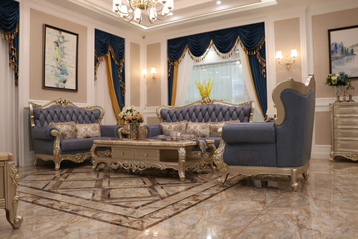 几何图形拼花地砖与蓝紫色的皮质沙发碰撞,无时不流露出高贵质感,家具的线条流露出曲线的美感和雕花工艺的精致。