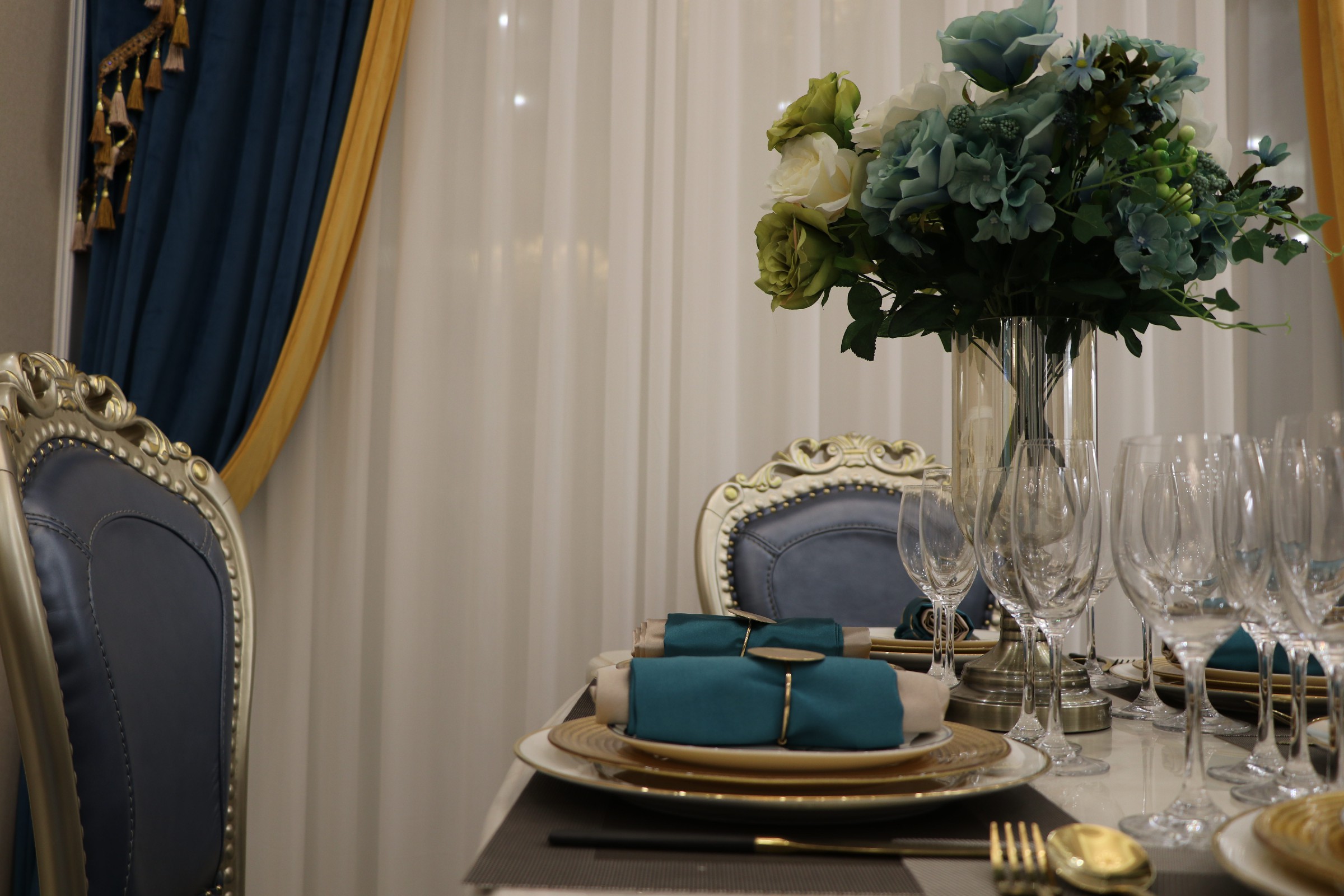 餐巾的浅蓝色与窗帘的深蓝形成同色系的搭配,在色彩上增加层次,主次分明,餐扣与餐具金属撞色给空间提升质感。