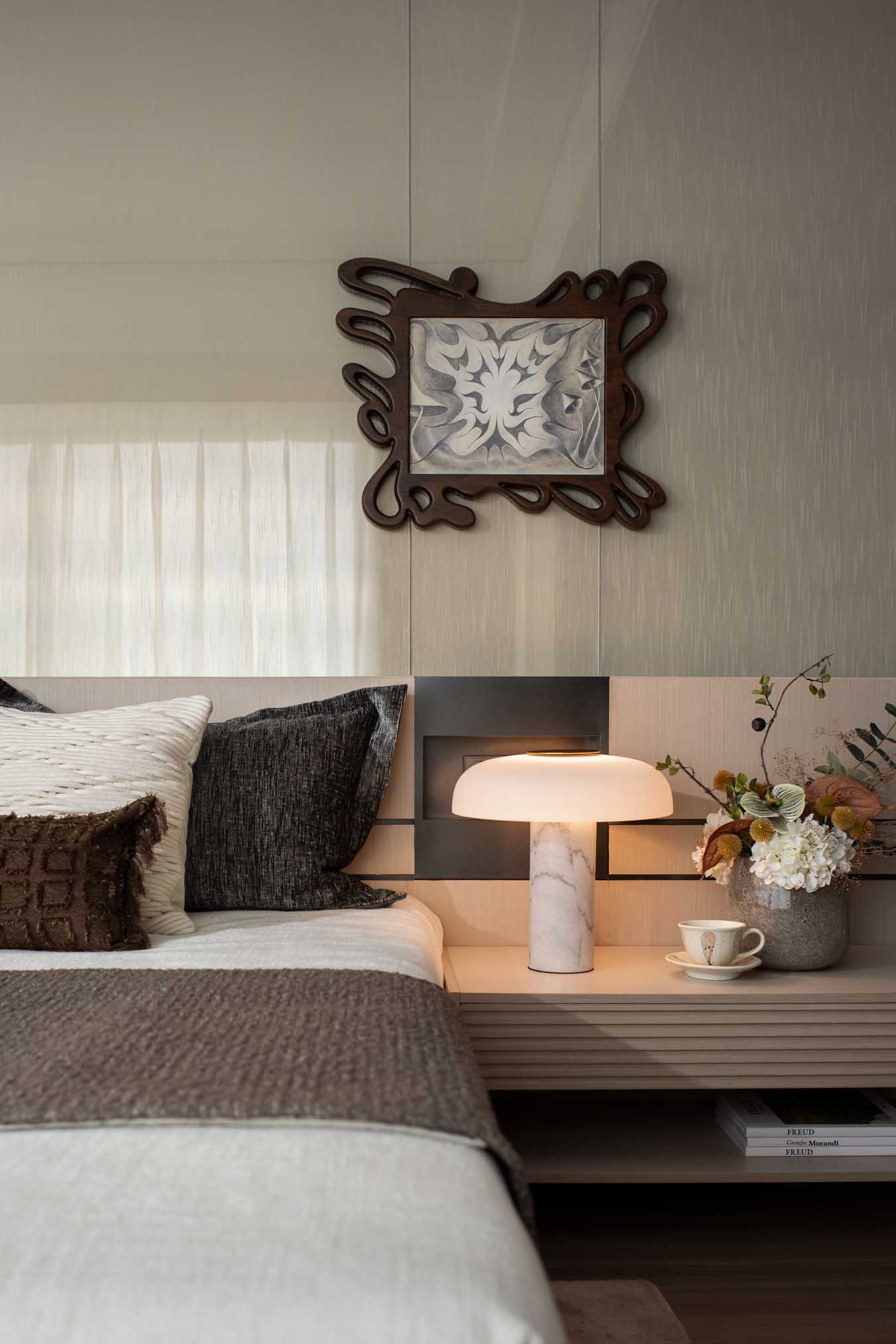 房子拥有豪宅般尺度感的奢阔主卧,270°的全景飘窗,搭配沙发触感的飘窗台,塑造如大客厅般的体验感。与高调的视野景观形成反差,居室内的材质设色则趋于低调的内省,以沉静和质感,回归居住的本质。