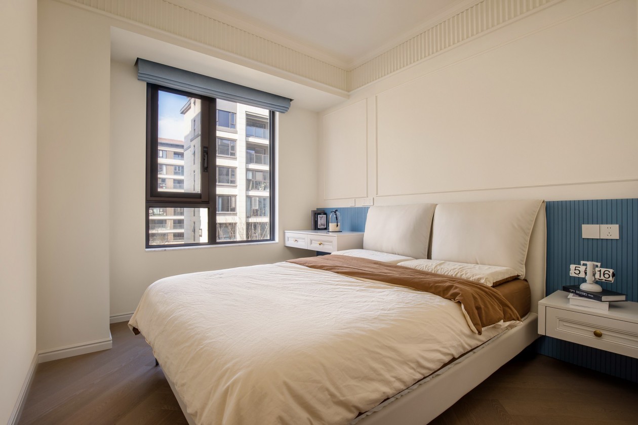 次卧作为儿童房,用护墙板做墙裙,丰富视觉造型层次。定制衣柜,床头一边床头柜、一边悬浮书桌,功能和颜值都很优秀。