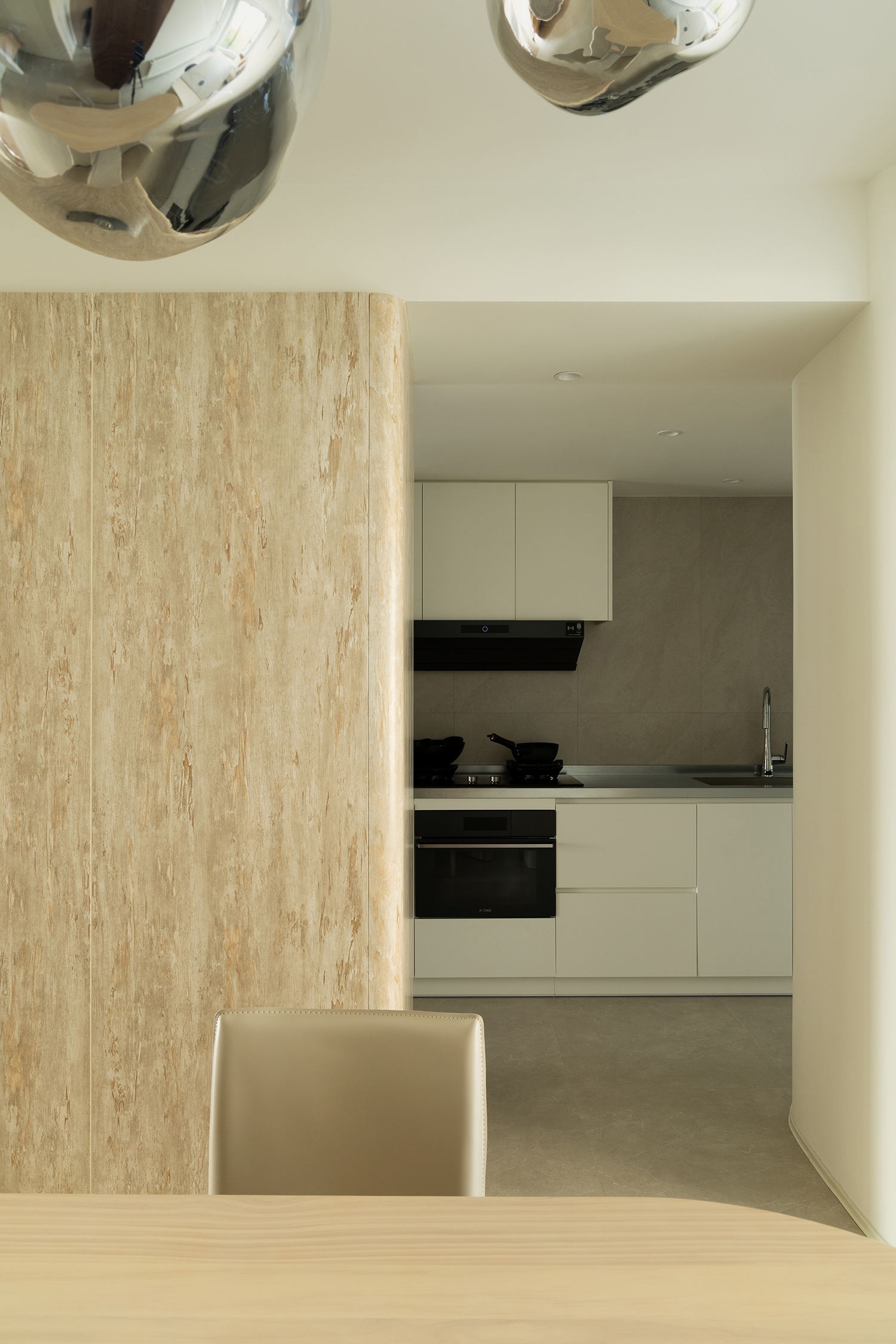 餐厨之间的隔断,在材质上做了区分,引入温润的木元素,木纹肌理赋予空间既自然又随性的美感。面向厨房的一侧,置入了一个水吧台,用于补充厨房收纳的同时,又可以巧妙地转变成餐厅的背景。