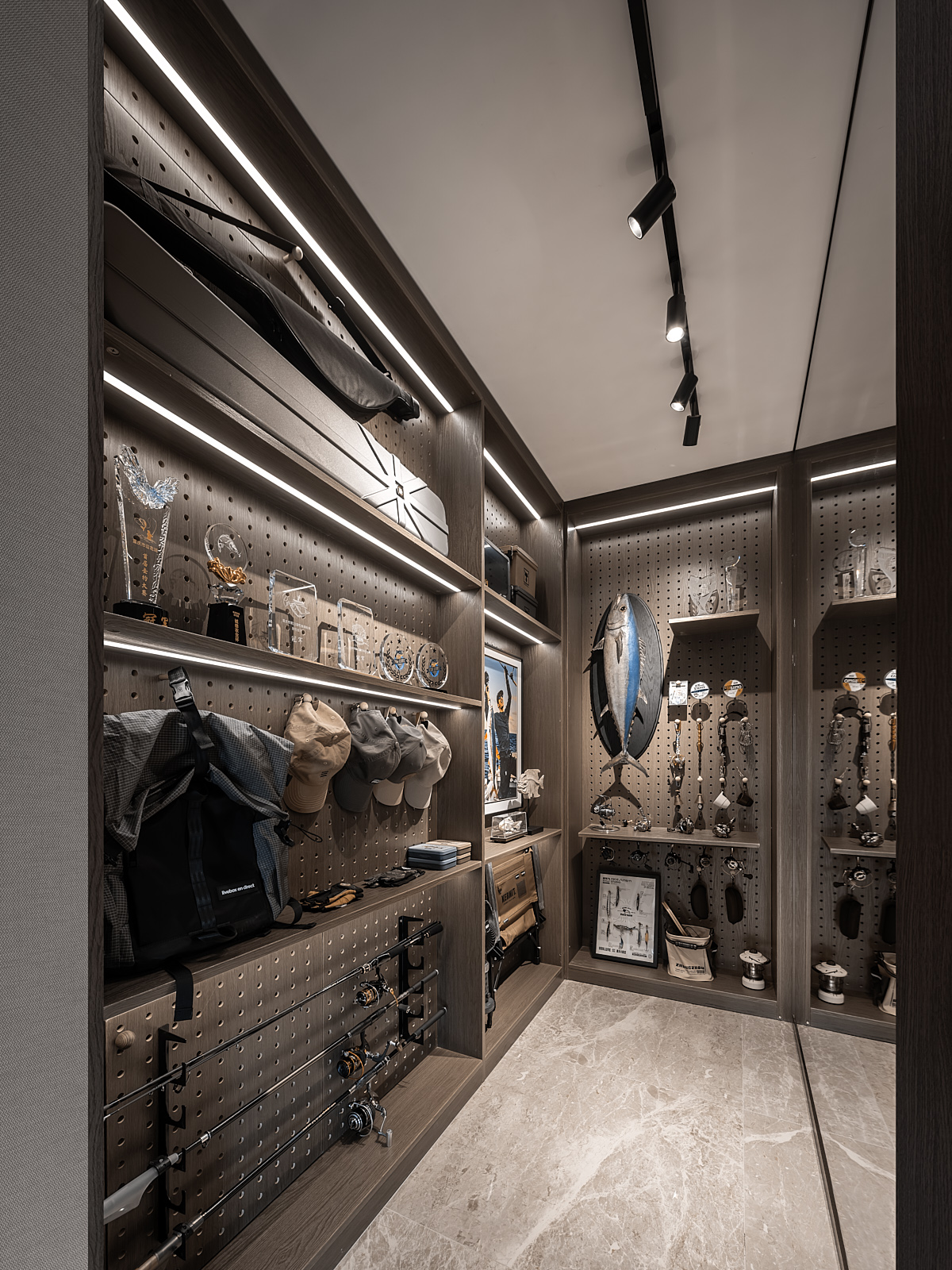 生活是旷野,不是轨道。入户玄关处悬挂别致的渔具收藏,以及巨大的金枪鱼标本,满满的渔获时刻,承载着屋主无数喜悦的记忆,每当亲友相聚,开怀畅聊垂钓趣事,何不是人生乐快意时刻。
