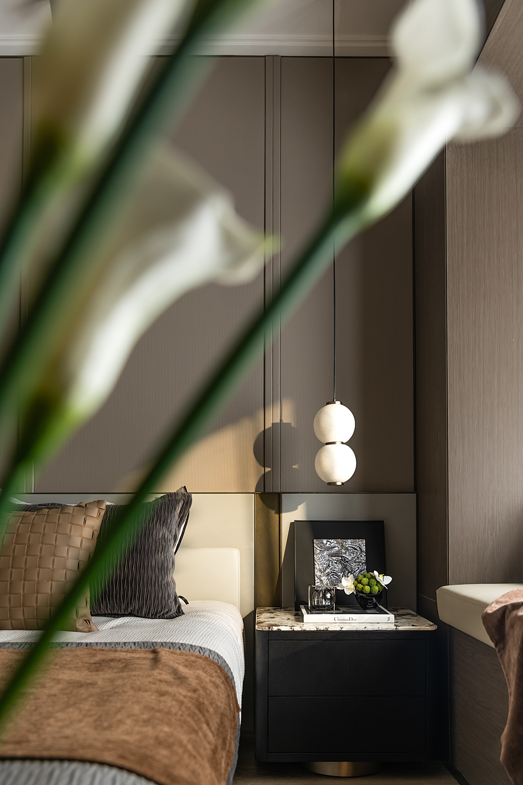回归到睡眠空间,沉稳的灰褐色顺势流淌,延续整体静谧温馨的氛围。与伴侣沏上一壶清茶,精神,就在这一器一物之中,观照出清灵隽逸的趣味。