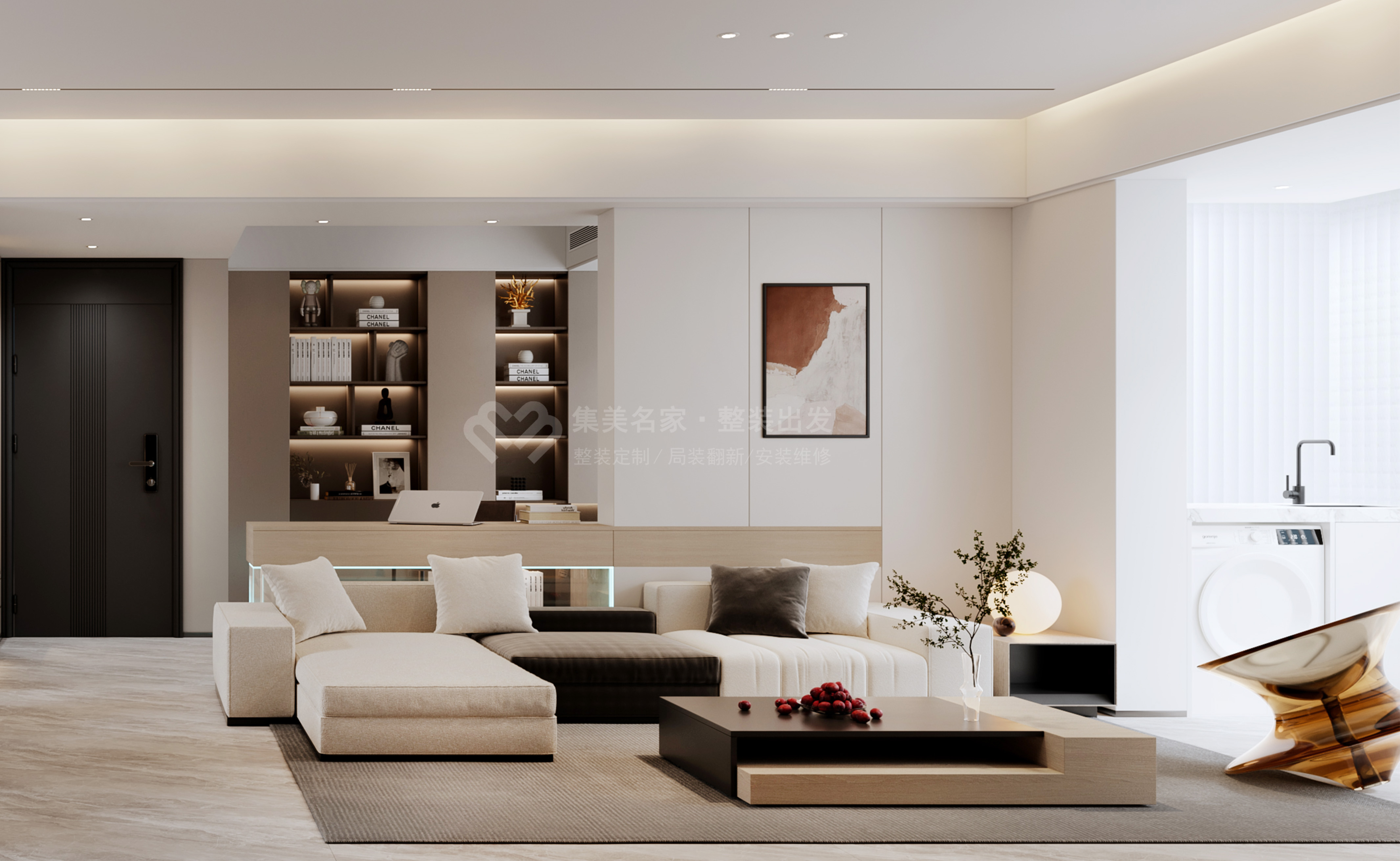 白色的钢琴键沙发与空间色调一致,笔直利落的线条,增加了沙发的立体感和线条美感,更添几分现代时尚气息,客餐厅的视觉可延伸至开放式书房,整个空间瞬间被浓郁的书卷气所充盈,营造出一种既高雅又充满文化底蕴的居住环境。