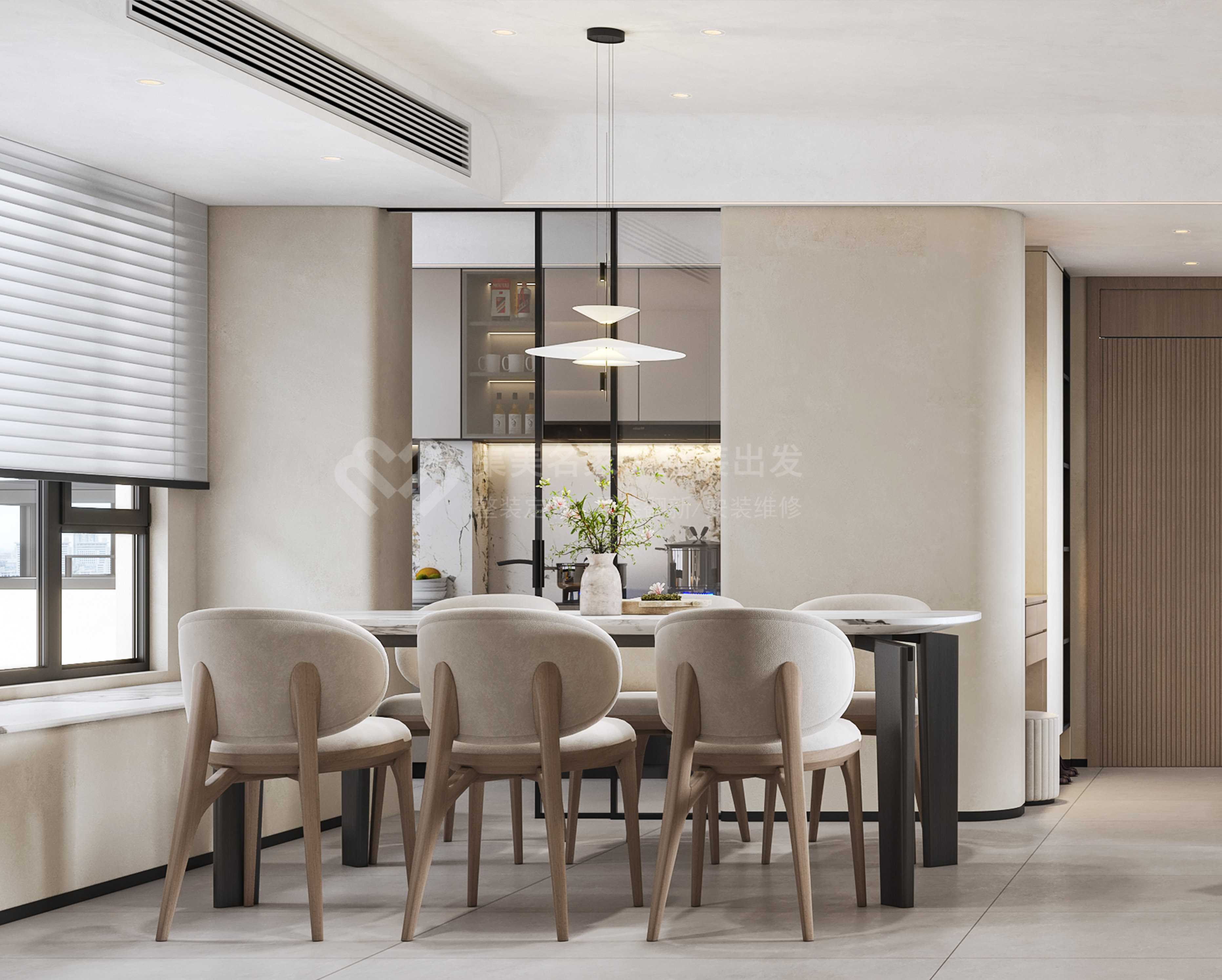 餐椅造型选用圆润的弧度,带来了满满的暖意。一盏设计感吊灯照明,就足够温馨,浪漫度过二人三餐四季。