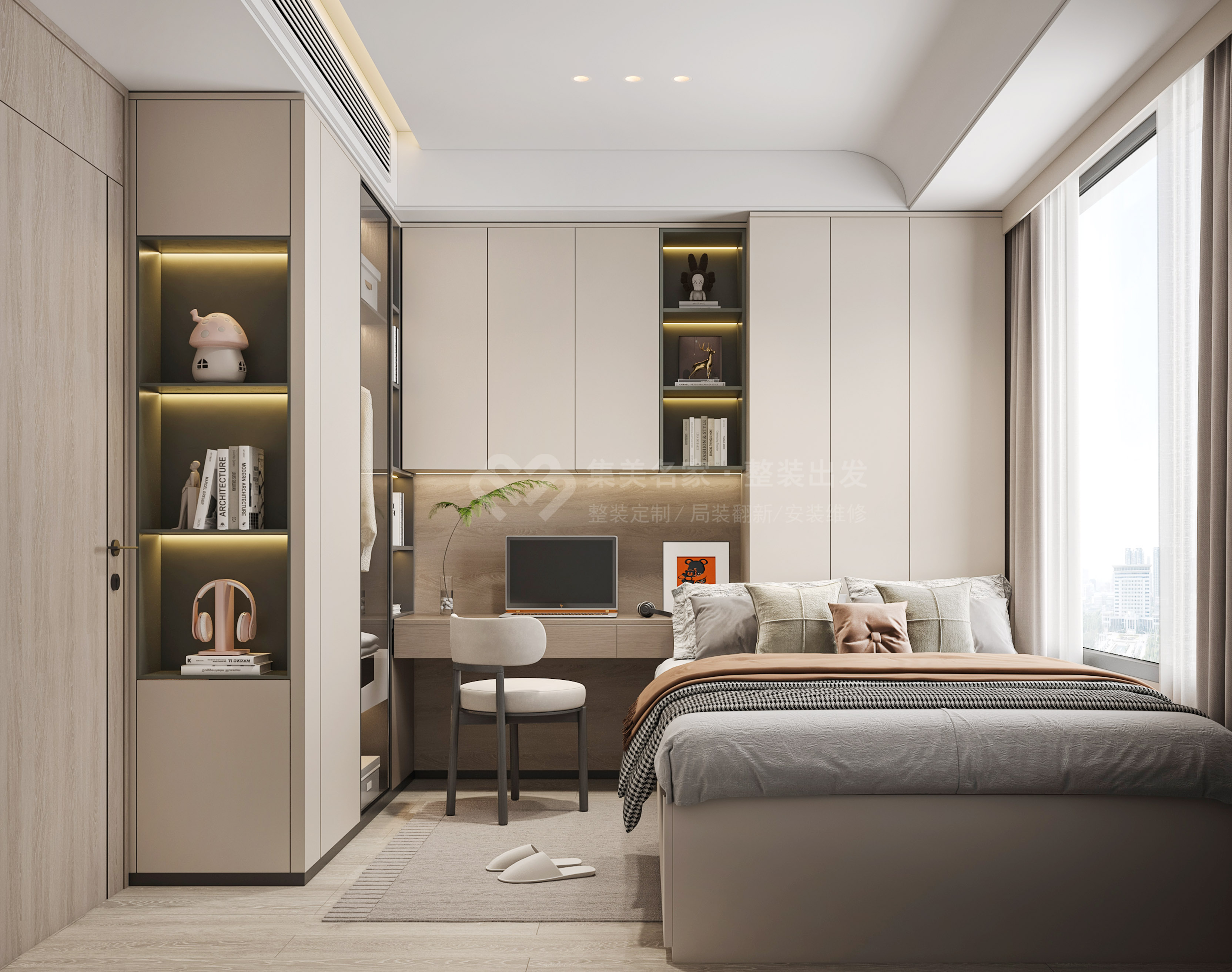 主卧以极简美学为核心,营造出一种沉稳而静谧的雅致氛围,让疲惫的心灵得以彻底释放,回归至纯粹的舒适休憩之地。