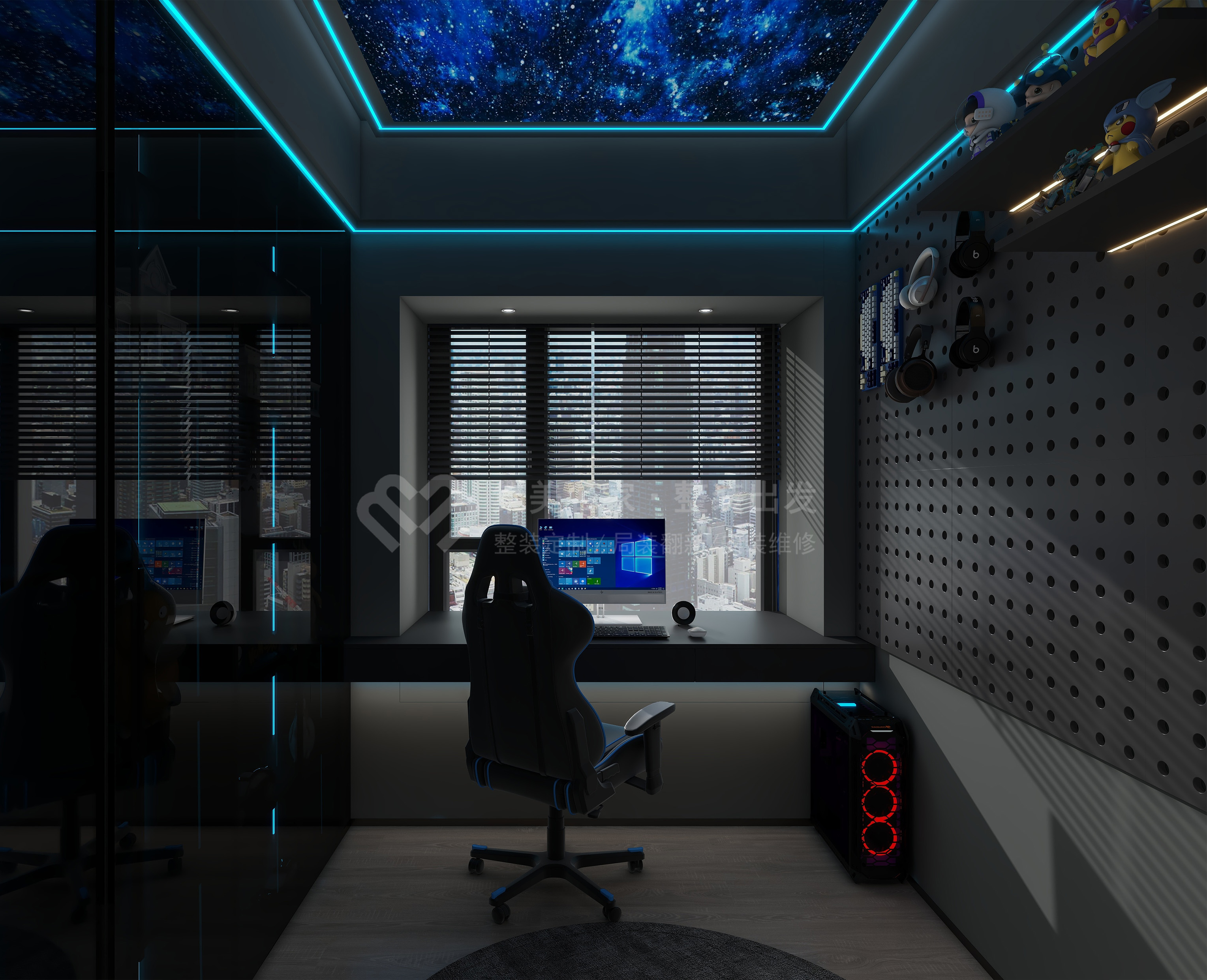 收纳柜采用半透明设计,完美满足了业主对手办收藏品的展示欲望;右侧墙面则安装了实用的洞洞板,轻松容纳日常游戏设备,顶部吊顶采用充满科技感的蓝色灯光,瞬间将整个房间沉浸在浓郁的赛博朋克氛围中。