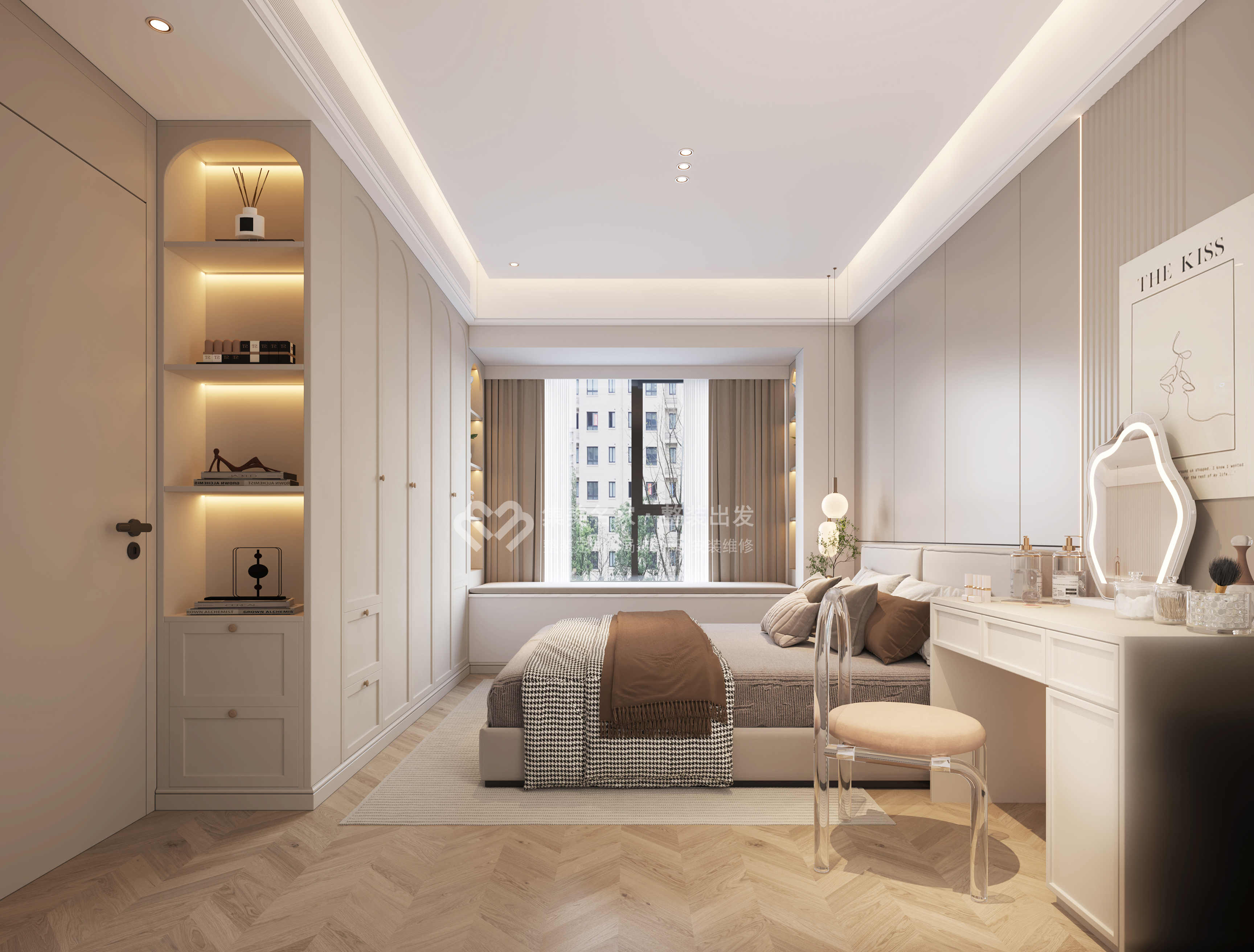 近3米的衣柜,为主卧提供足够的收纳空间,飘窗台上的小空间也设计了开放式隔板书架,可放置手提包,书籍等物品。想象一下,闲暇时光,倚靠在窗台喝茶,看书,身心都能得到无比放松~