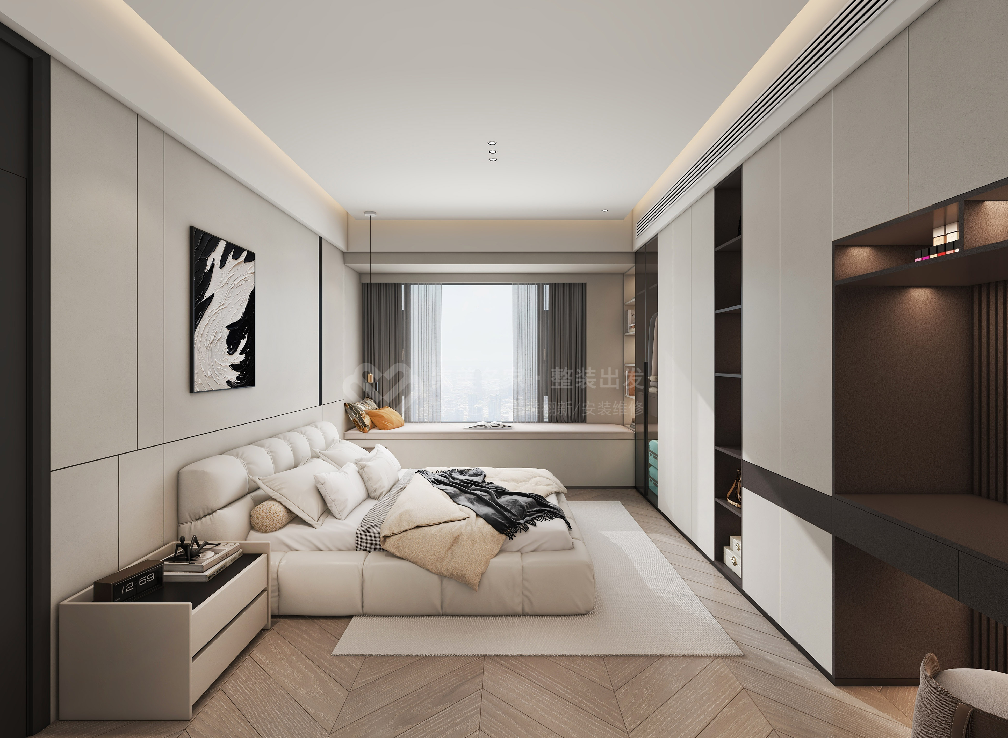 靠墙而设的整排衣柜组合柜,设计简约而不失大气,不仅满足了丰富的收纳需求,还嵌入了梳妆台,使得功能性得到了极大的提升,既实用又美观。